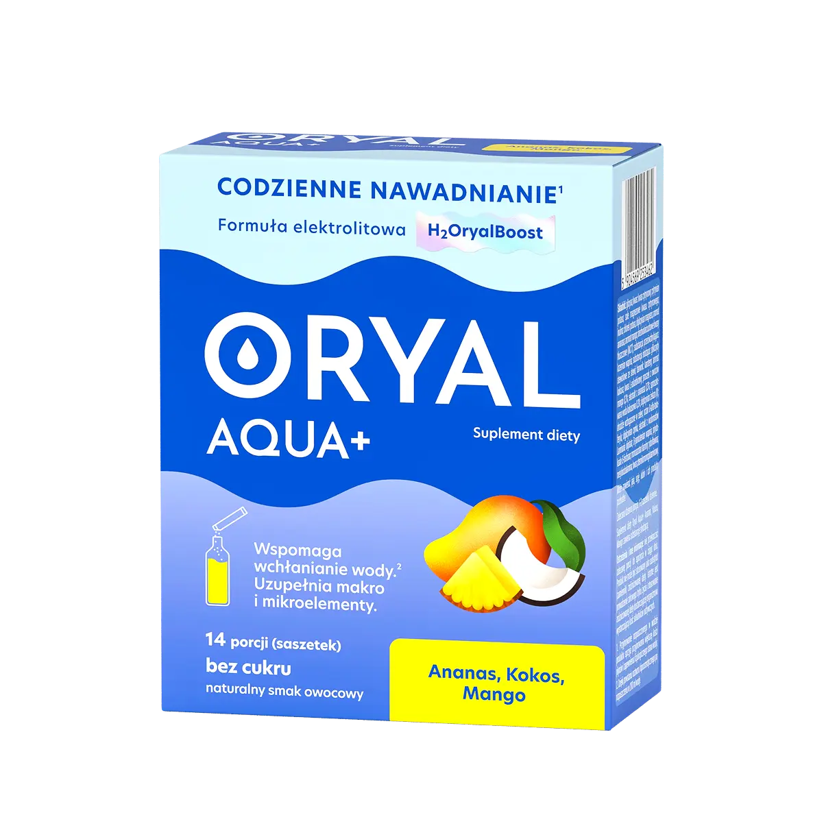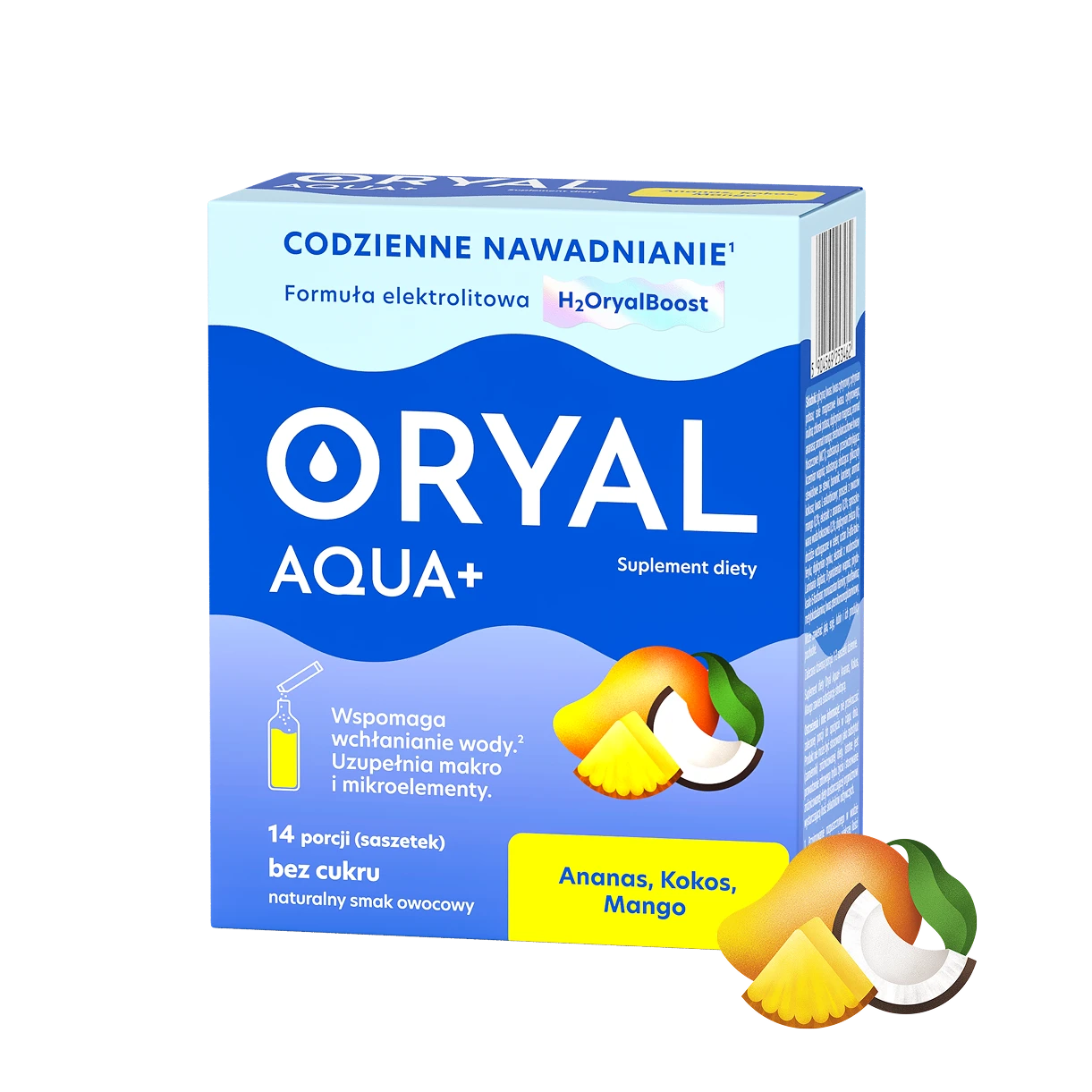 Suplement diety Oryal Aqua Plus Ananas, Kokos, Mango zawiera formułę H2OryalBoost: połączenie elektrolitów z prebiotykiem.
