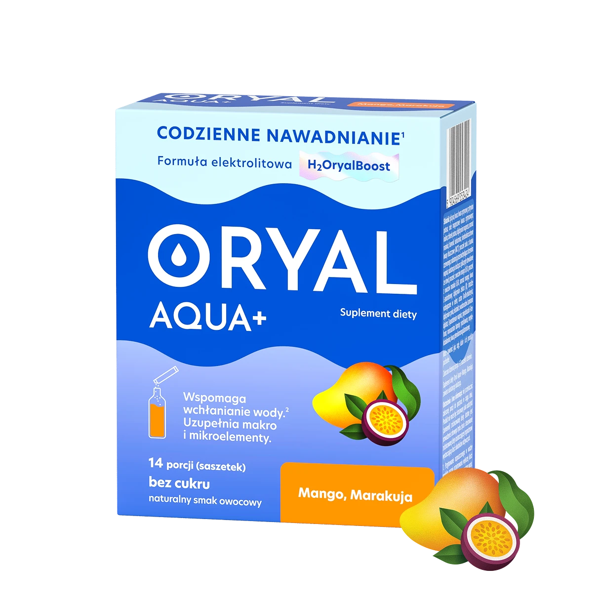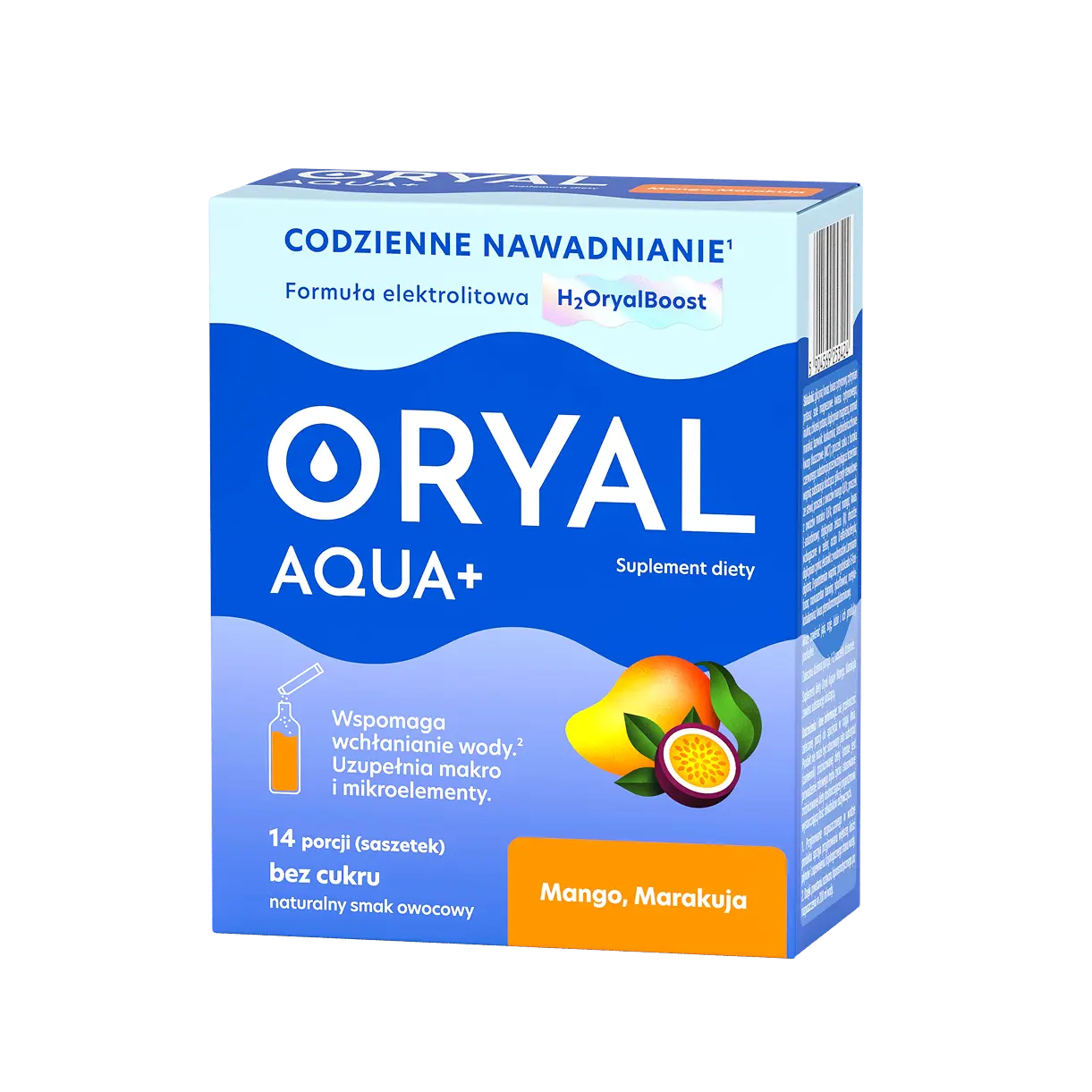 Suplement diety Oryal Aqua Plus Mango, Marakuja zawiera formułę H2OryalBoost: połączenie elektrolitów z prebiotykiem.