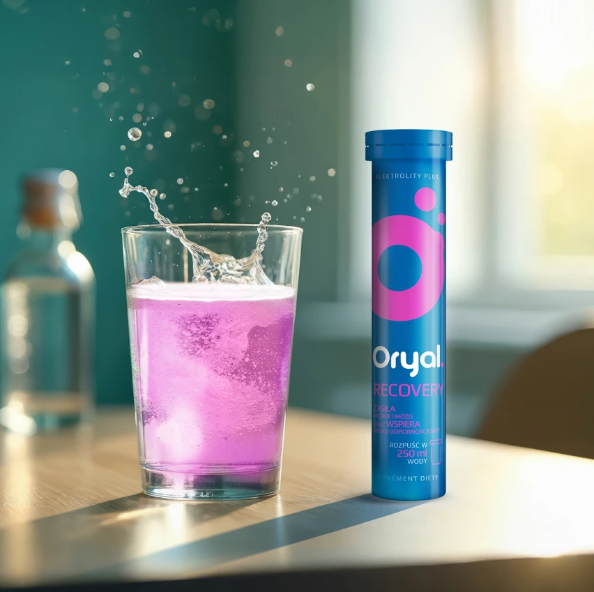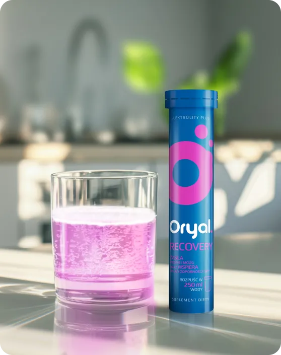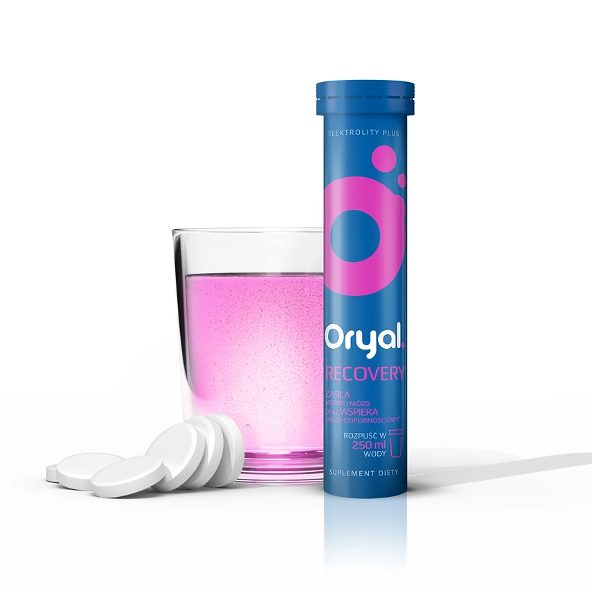Oryal Recovery zasila mięśnie i mózg1 oraz wspiera układ odpornościowy2. To suplement diety w formie musujących tabletek do rozpuszczenia w wodzie, który dostarcza kluczowe elektrolity niezbędne w prawidłowym funkcjonowaniu organizmu: potas, magnez, wapń oraz sód wraz z chlorkiem. Dodatkowo Oryal Recovery zawiera witaminy C, D i B12, które wspierają układ odpornościowy, a także Ashwagandhę, która pomaga w utrzymaniu dobrego samopoczucia.