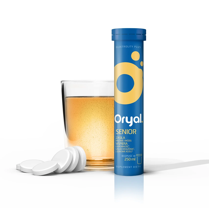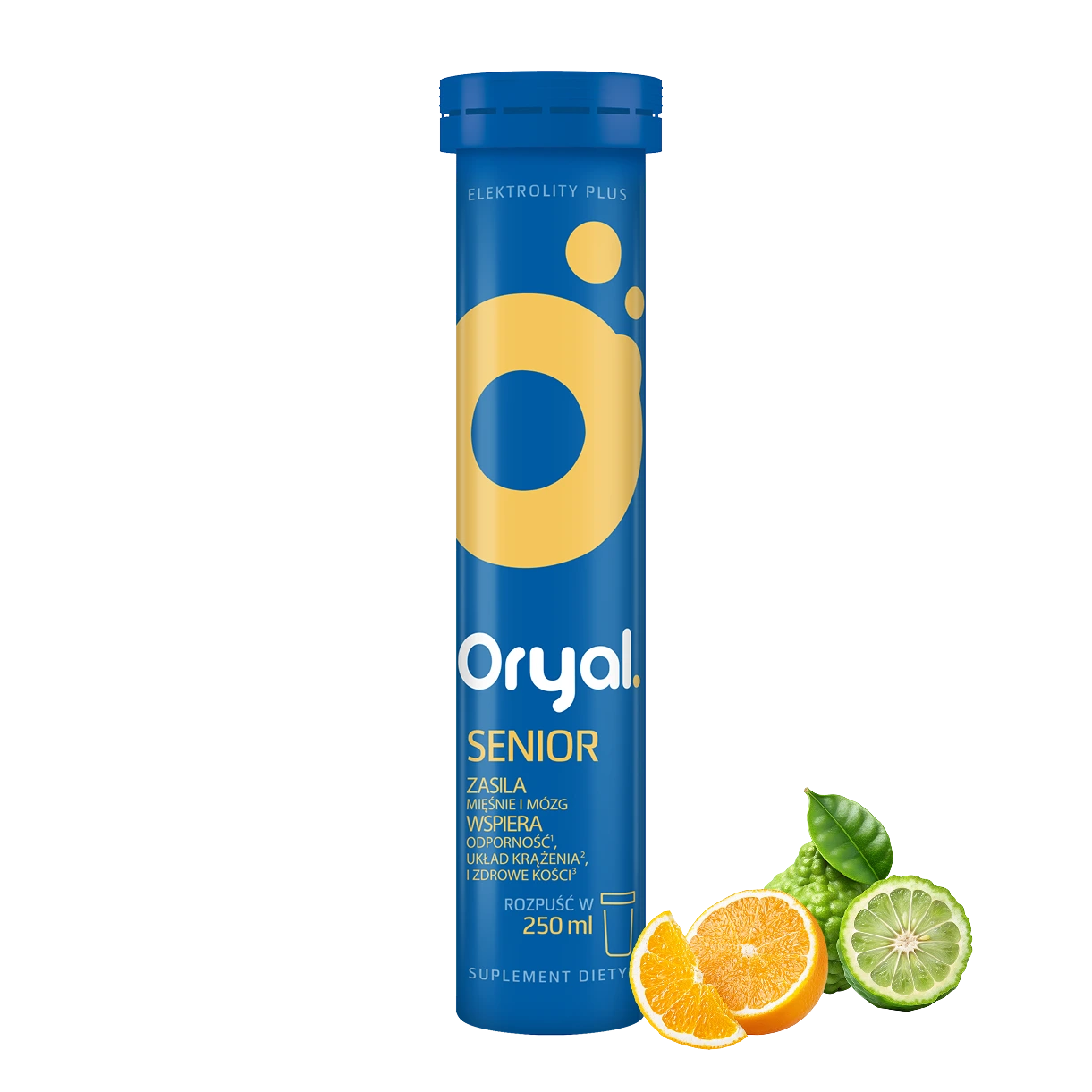 Oryal Senior zasila mięśnie i mózg1, wspiera odporność2, układ krążenia i zdrowe kości4. Suplement diety Oryal Senior dostarcza kluczowe elektrolity niezbędne w prawidłowym funkcjonowaniu i nawodnieniu organizmu: potas, magnez, wapń, sód oraz chlorki. Dodatkowo zawiera ekstrakt z pestek winorośli właściwej wspierającej prawidłowe krążenie3 w kończynach dolnych.